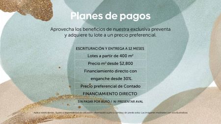 Los lotes disponibles comienzan desde 400 m y desde un precio de $2,800.00 por metro cuadrado. Ofrecemos una opción de financiamiento directo que no requiere revisión de buró de crédito ni aval, con un enganche inicial a partir del 30%, y la escrituración y entrega se lleva a cabo en un plazo de 12 meses.